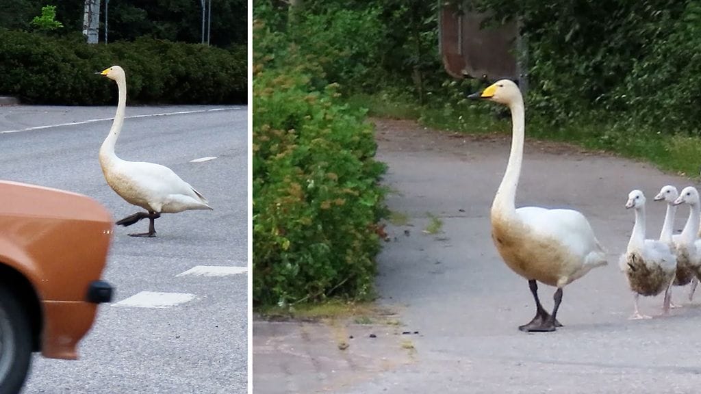 Yllä olevalla videolla voi nähdä kokonaisen laulujoutsenperheen keskellä taajamaa. Joutsenet vähät välittävät paikallisesta liikenteestä.