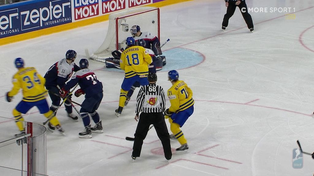 Ruotsin William Karlsson raapi pelivälineen sivuun, ja Dennis Everberg oli kärppänä paikalla ja laukoi kiekon kolmannen kerran ohi slovakkivahti Julius Hudaceckin. Tämä maali riitti Hudacekille ja tolppien väliin luisteli Jaroslav Janus.