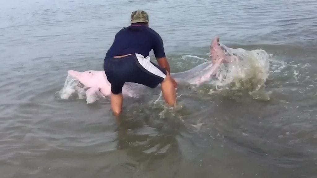 Harvinainen vaaleanpunainen delfiini joutui pulaan uituaan matalaan rantaveteen Ko Sukon saarella Thaimaassa.