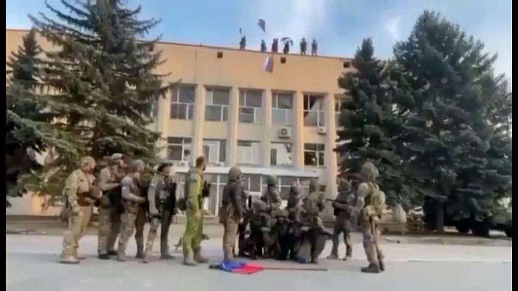 Lauantai-iltana Ukrainan maahanlaskujoukkojen 81. prikaati julkaisi videon, jossa ukrainalaissotilaat repivät Venäjän liput rakennuksen katolta ja heittävät maahan. Tilalle he nostavat Ukrainan lipun.