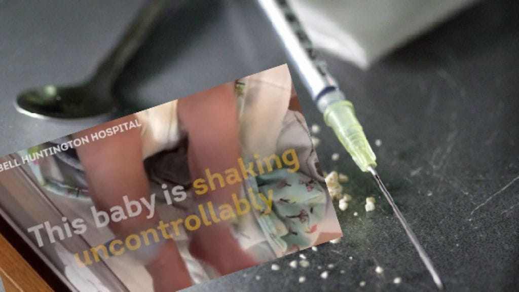 Videon alussa näkyy, miten vieroitusoireista kärsivä vauva tärisee holtittomasti.