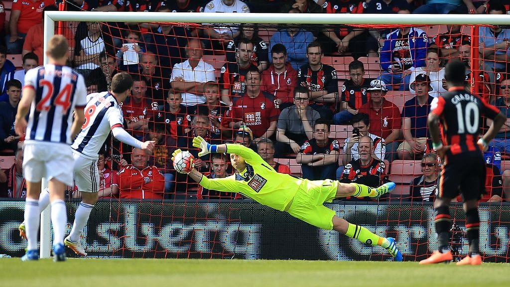 Bournemouthin Artur Boruc esitti upean tuplatorjunnan rangaistuspotkusta jalkapallon Englannin Valioliigan toiseksi viimeisen kierroksen ottelussa West Bromwichia vastaan.