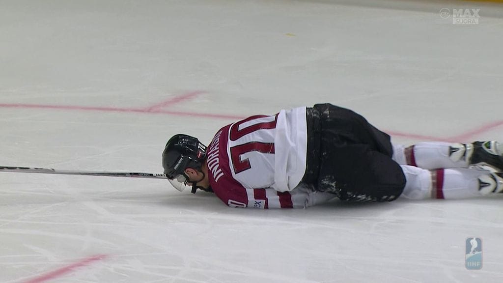 Venäjän jääkiekkomaajoukkueen puolustaja Aleksei Jemelin lensi suihkuun Latvia-ottelun toisessa erässä.