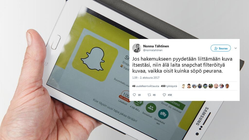 – Jos hakemukseen pyydetään liittämään kuva itsestäsi, niin älä laita snapchat filteröityä kuvaa, vaikka oisit kuinka söpö peurana, Tähtinen toteaa Twitterissä.