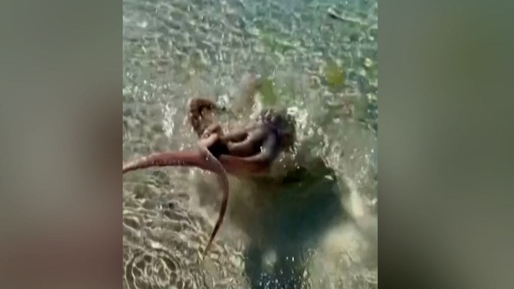 Lähemmäs mentyään paljastui, että kyseessä on mustekala. Yllä olevalla videolla nähdään, kuinka vihainen mustekala uiskentelee lähellä rantaviivaa, ja iskee lonkeronsa kuvaajaa kohti. Vesi räiskyy mustekalan yllättävästä liikkeestä.