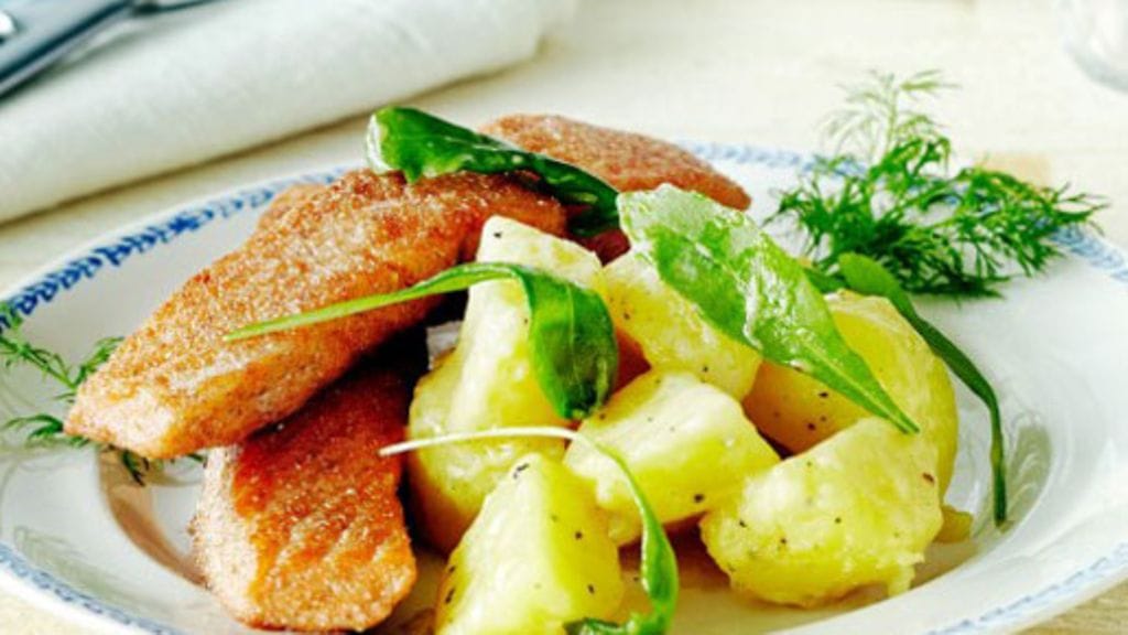 Rukiiset lohipalat ja rucola-perunasalaatti