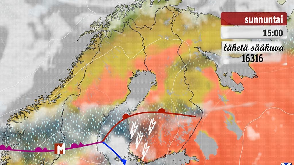 Ukkoset yleistyvät lauantain ja sunnuntain välisenä yönä. Sunnuntaina päivällä ukkostaa etenkin maan eteläosassa Kokkola-Kuopio-linjan eteläpuolella. Ukkosherkin alue on lounaassa.