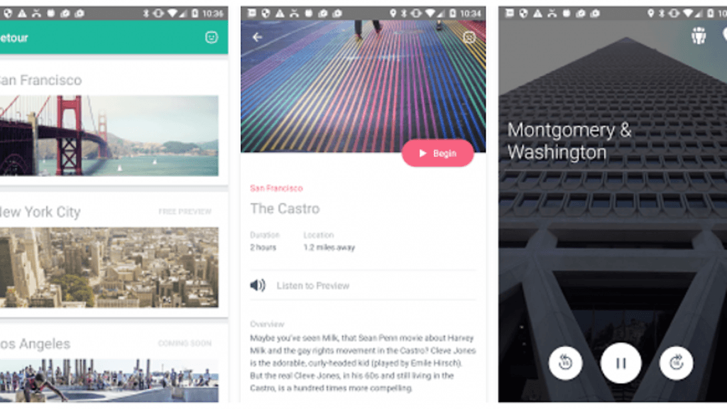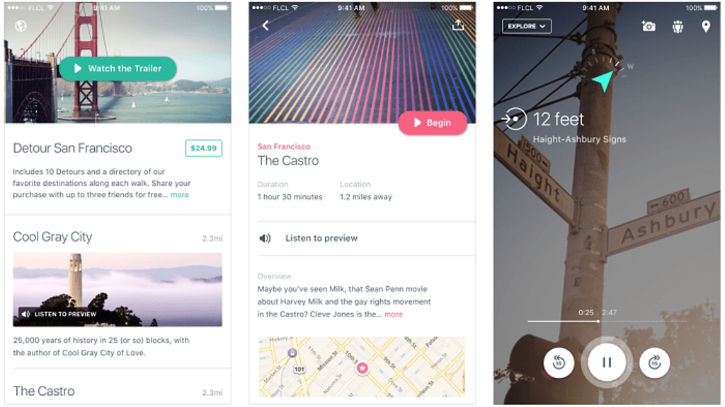 Ääniopastetut kierrokset esimerkiksi museoissa lienevät monille tuttu idea, mutta Detour vie idean vielä pidemmälle. Sovellus tarjoaa huolella viimeistellyn ääniopastuksen, joka esittelee kaupunkien mielenkiintoisia ja hienoja kohteita sekä käymisen arvoisia paikkoja. Sovellus myös tunnistaa käyttäjän sijainnin ja osaa sen perusteella tarjota tietoa eri kohteista.