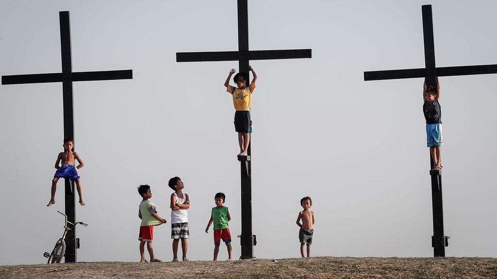 Filippiineillä ikuistettiin pikkulapsia leikkimässä risteillä, jossa todistettiin pitkäperjantaina makaaberia perinnettä: kymmenet ihmiset antavat naulita itsenä ristille Jeesuksen kärsimyksiä imitoiden.