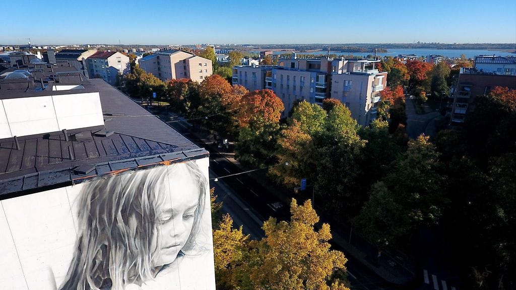 Tällä viikolla ihailemme Helsingin saamaa katutaidetta, muraalia, johon on piirretty nuoren tytön kasvot. Kuvan tyttö on nimeltään Pinja, ja hän asuu taitelijan mukaan tässä samaisessa talossa. Teos valmistui Pinjan nimipäivänä.