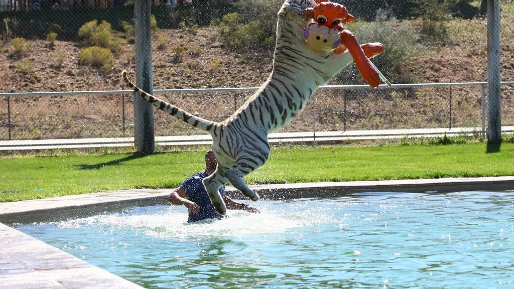 Uskaltaisitko hypätä uima-altaaseen tiikereiden kanssa? Arizonalaisessa Tiger Splash -show'ssa kouluttajat ja täysikasvuiset kissaeläimet leikkivät yhdessä vesileikkejä.
