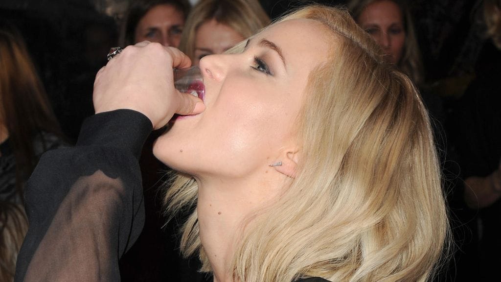 Tähteä ei hidasta edes punaisen maton tuomat paineet. Päinvastoin, Nälkäpeli: Matkijanärhi 2 -elokuvan toisessa ennakkonäytöksessä koko elokuvan kaarti nautiskeli viskishotteja estoitta punaisella matolla.