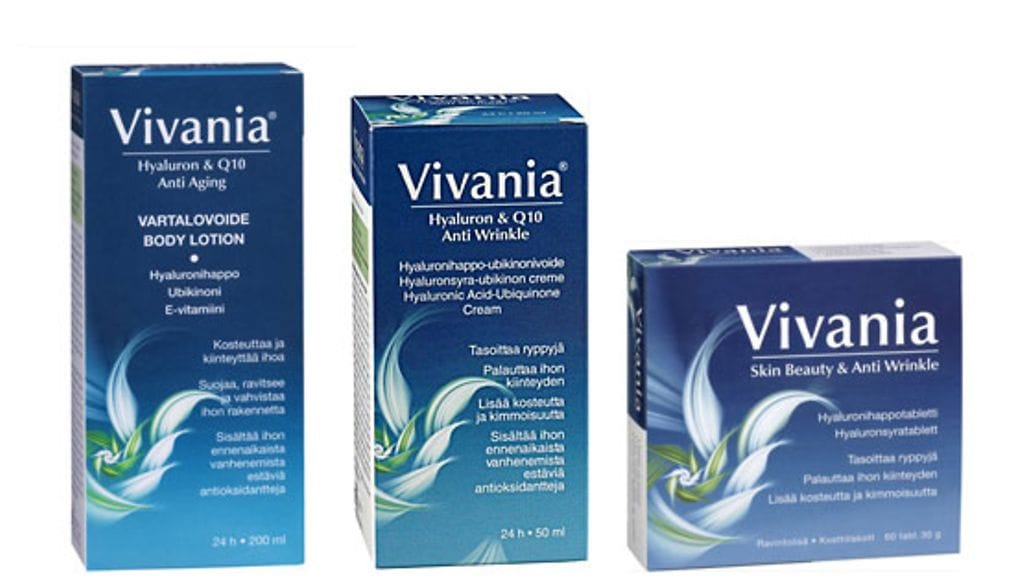 Helmen Vivania -testiryhmään valittiin yli 40-vuotiaita naisia kokeilemaan kauneuden ja hyvän mielen tuotteita. Testattavana on kolme Vivania-tuotetta: Hyaluronitabletit, Hyaluron & Q10 Anti Aging vartalovoiteen sekä Hyaluron & Q10 Anti Wrinkle -kasvovoide.