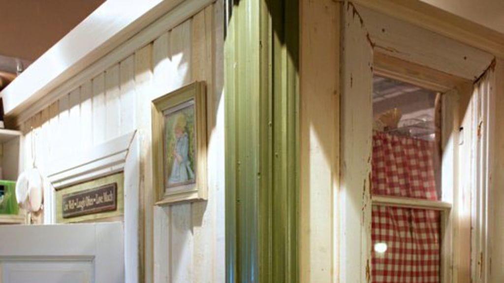Kahvilan seinäpintoja on rytmitetty Larssonin maalauksista tutuilla puulistoituksilla ja paneloitu vanhoilla holvikaarellisilla keittiökaappien ovilla. Samoja ovia on käytetty kahvilan tiskissä, joka on viimeistelty sormipanelilla ja metsänvihreällä maalilla.
