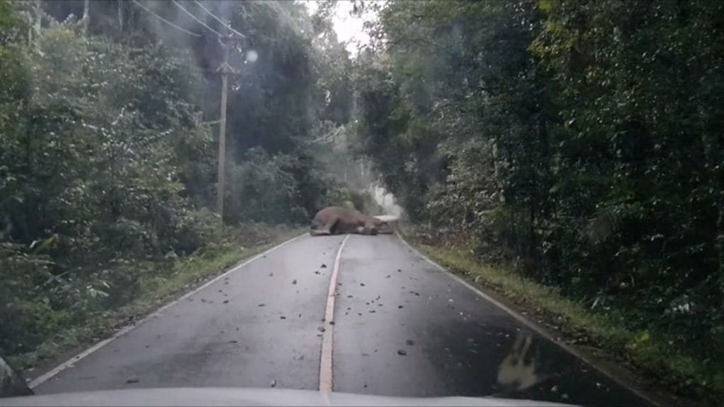 Mies näki ison elefantin nukkumassa poikittain keskellä tietä.