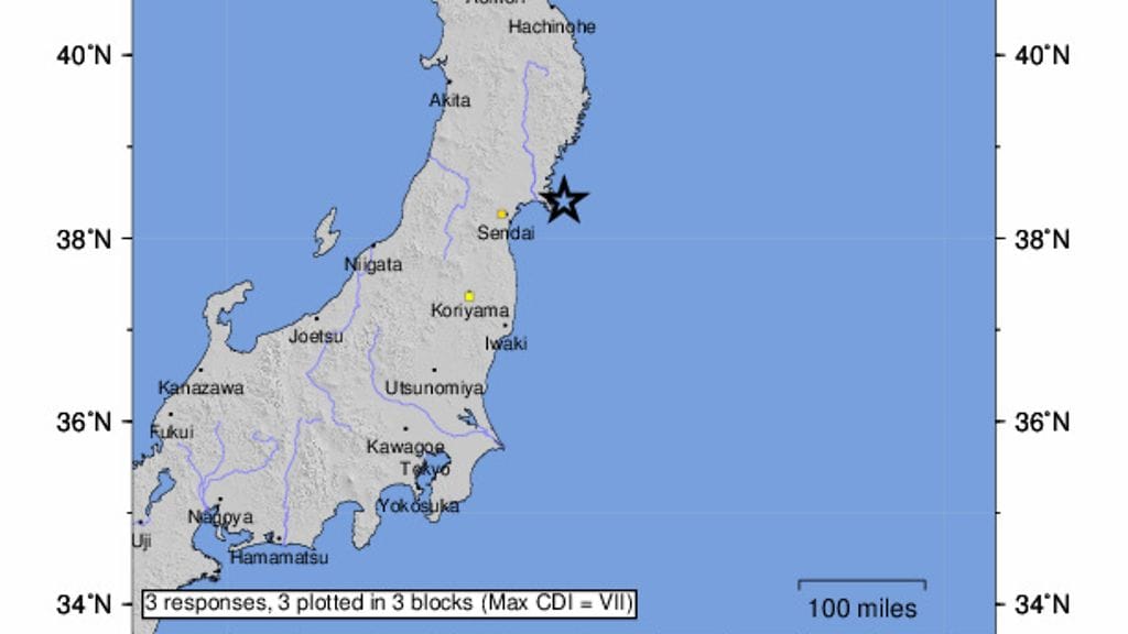 Japanin koillisrannikon edustalla tapahtunut maanjäristys oli voimakkuudeltaan 7,2 ja tapahtui noin 60 kilometrin syvyydessä. Järistys iski alkuillasta paikallista aikaa Tyynellämerellä lähellä Miyagin prefektuuria.