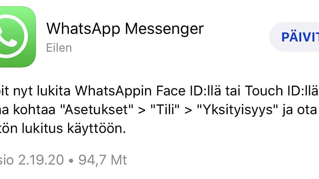WhatsApp on nyt mahdollista lukita erikseen Face ID -kasvojentunnistuksella tai Touch ID -sormenjälkitunnistuksella. Näin sovellus pysyy lukittuna ja sen tiedot salassa esimerkiksi vaikkapa, kun vanhempi muuten avaa puhelimen lukituksen ja lainaa sitä lapselleen.