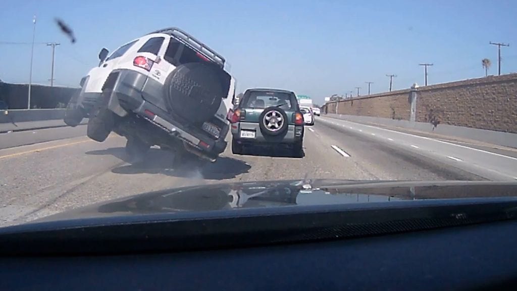 Täysin hallitsematon maastoauto törmää naisen edessä olevaan autoon ja heittää volttia moottoriteillä rajun näköisesti.