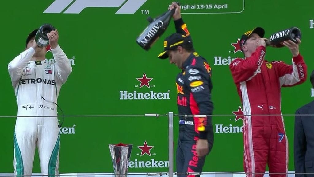 Palkintopallilla Ricciardo liikuttui kyyneliin kuunnellessaan Australian kansallislaulua. Tämän jälkeen alkoivat juhlat, jotka käynnistyivät Bottaksen ja Räikkösen kohdalla tietysti hörpyllä ennen kuin kaksikko alkoi kastella ympäristöään kuohuviinillä.