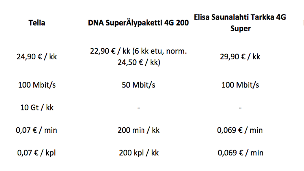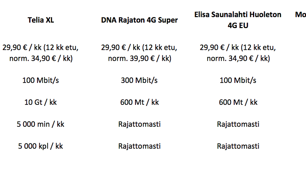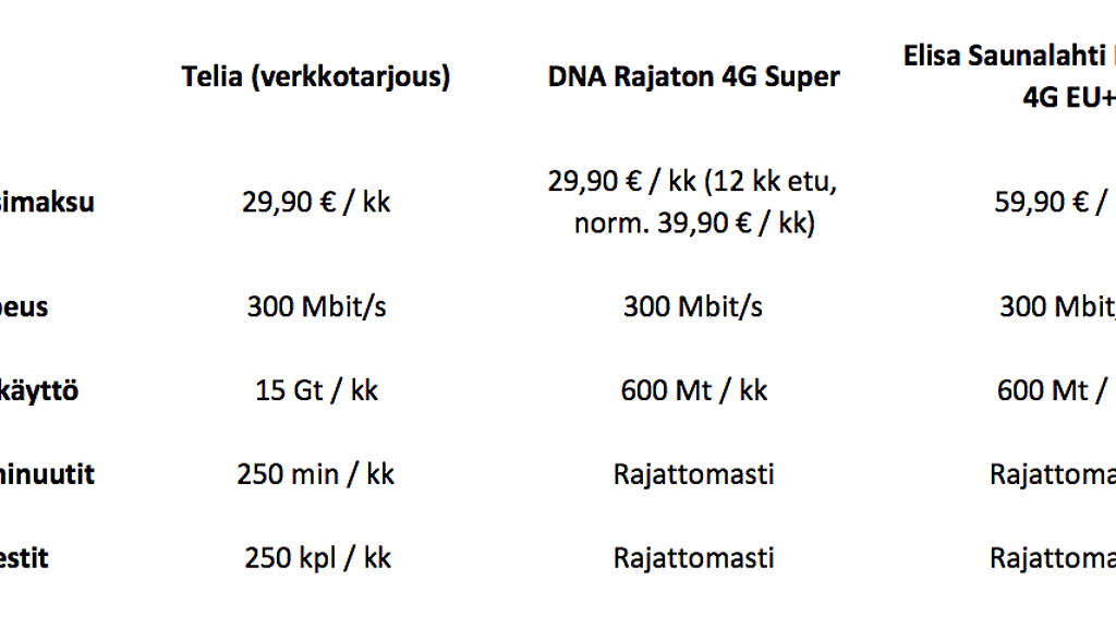 Telian uusi liittymätarjonta kilpailukykyinen, paljastaa yksinkertainen vertailumme. Eri operaattoreiden – DNA:n, Elisan, Moin ja Telian – vertailu ei ole aivan yksinkertaista. Tämän takia alta löytyvät muutama tapaustakaan eivät kata kaikkien käyttäjien erilaisia tilanteita. Suosittelemmekin ennen liittymän vaihtoa jokaista tarkistamaan omien tarpeidensa mukaisen tarjonnan myös itse kaikkien eri operaattorien sivuilta.