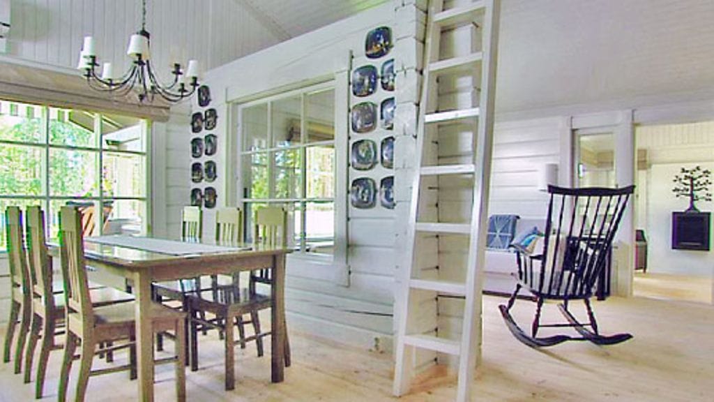 Jos haluat, voit korostaa ajankuvaa päivittämällä myös muuta sisustusta 80-luvun tyylin mukaisesti, mutta tähän päivään kesämökkiä voi sutia valkoisella maalilla.