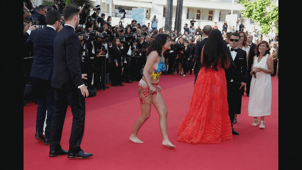 Tuntemattomaksi jäänyt nainen rynnisti punaiselle matolle Cannesin elokuvajuhlilla osoittaakseen mieltä Ukrainan sodassa tapahtuvaa seksuaalista väkivaltaa vastaan. Tapahtuneesta uutisoivat useat ulkomaalaismediat.