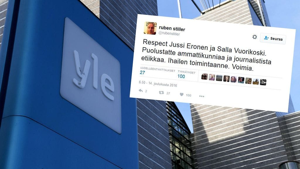 Yle-kohun keskiössä myöskin ollut, toimittaja ja Pressiklubi-ohjelman juontaja Ruben Stiller ihailee twiitissään entisten Yle-työtovereiden journalistista etiikkaa.