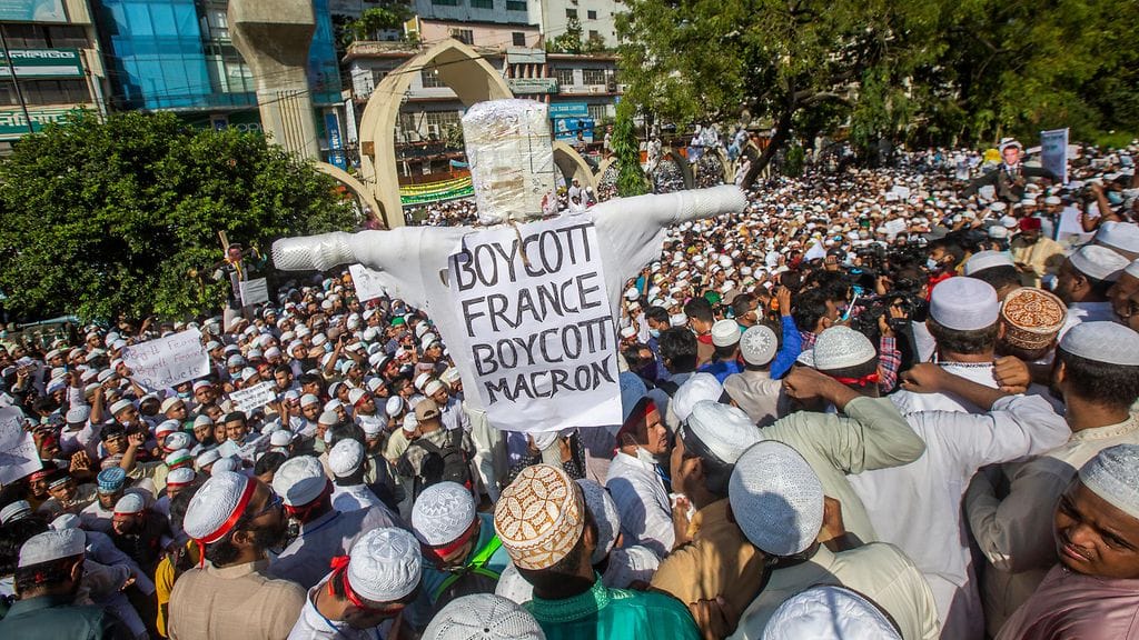 Maan pääkaupunki Dhakaan kokoontuneet mielenosoittajat vaativat muun muassa ranskalaisten tuotteiden boikottia ja polttivat Macronia esittäviä kuvia. Poliisi esti mielenosoittajia marssimasta Ranskan suurlähetystön liepeille.