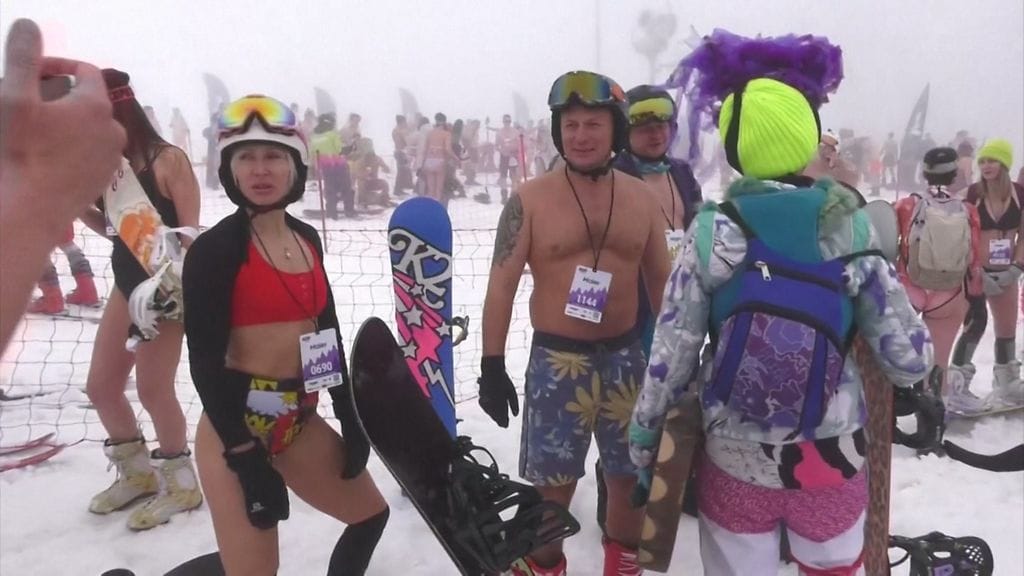 Vaikka lämpötila oli vain kahdeksan astetta, ei se estänyt juhlakansaa pukeutumasta ainoastaan uima-asuihin.