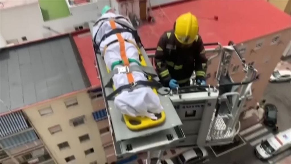 Kerrostalon ylimmässä kerroksessa asunut 91-vuotiaan miehen epäiltiin sairastuneen koronaviruksen aiheuttamaan tautiin. Ikäihmistä ei voitu kuljettaa alas hississä, joten mies piti saada maankamaralle jollain toisella, mahdollisimman turvallisella tavalla.
