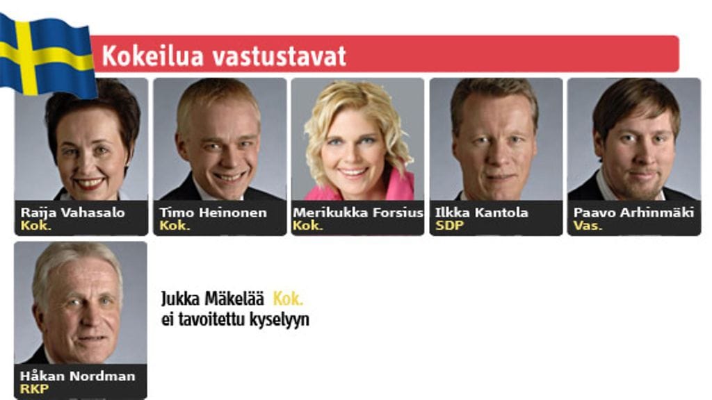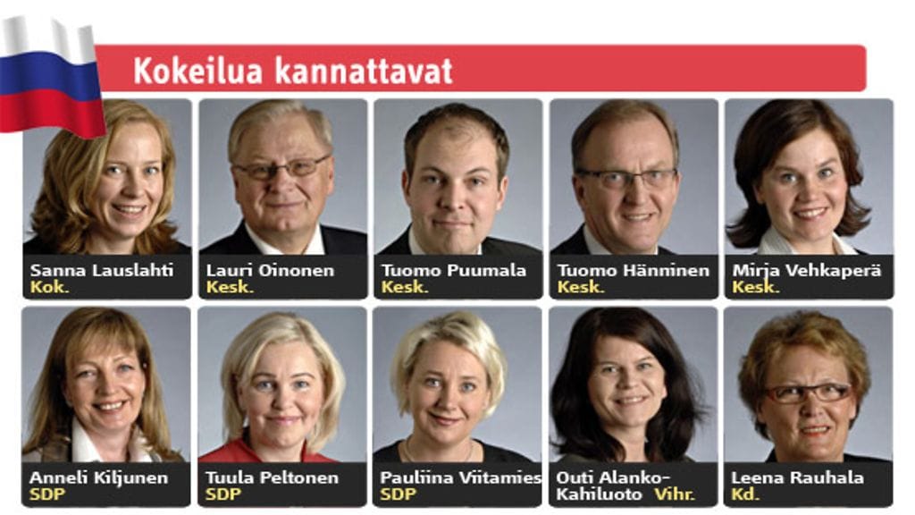 Kokeilua kannattavat Sanna Lauslahti (Kok.), Lauri Oinonen (Kesk.), Tuomo Puumala (Kesk.), Tuomo Hänninen (Kesk.), Mirja Vehkaperä (Kesk.), Anneli Kiljunen (Sd.), Tuula Peltonen (Sd.), Pauliina Viitamies (Sd.), Outi Alanko-Kahiluoto (Vihr.) ja Leena Rauhala (Kd.).