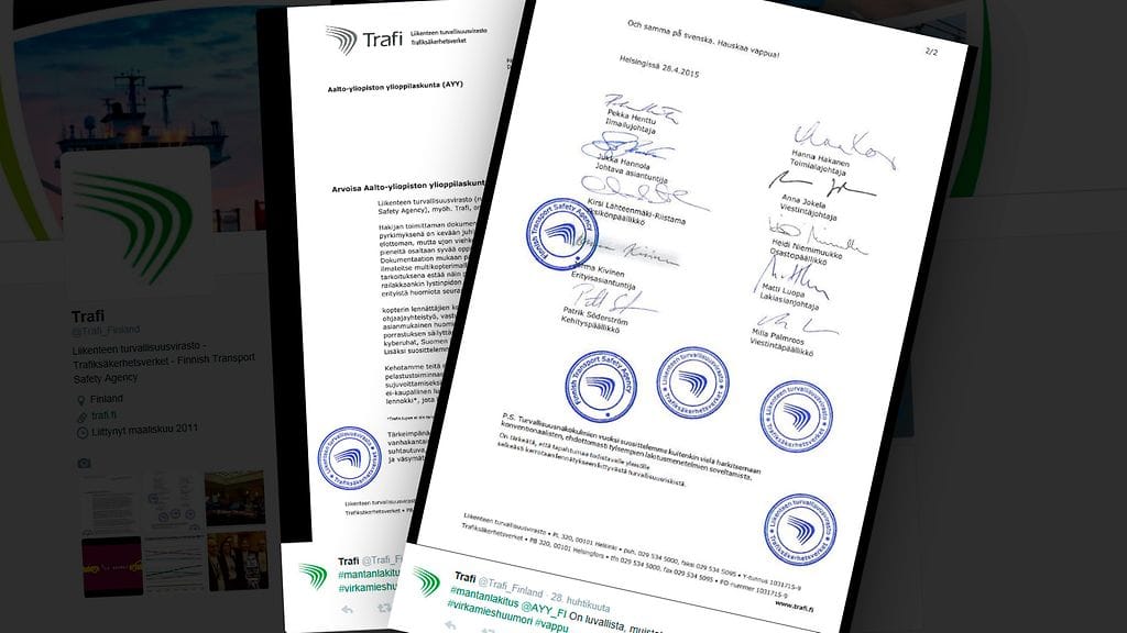 – Aivan sinisilmäisesti kysyimme Trafilta lupaa lennokin käyttöön. He kertoivat, ettei heidän lupaansa tarvita, mutta ehdottivat taas tällaisen hauskan "melkein päätöksen" kirjottamista. Meistä se oli todella hauska idea, Kihlström kertoo.