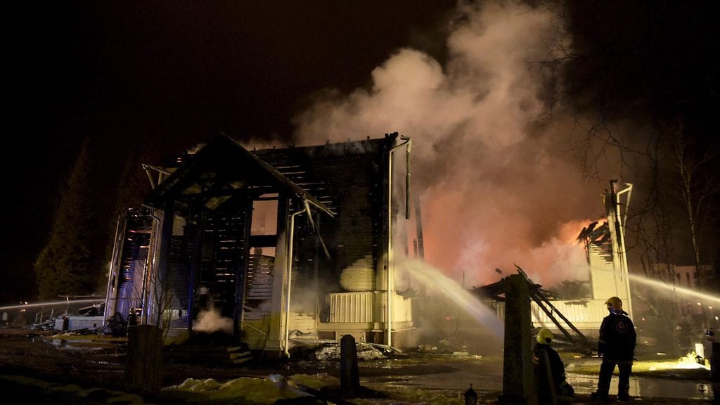 Vanha puukirkko tuhoutui palossa täysin. Kukaan ei kuitenkaan loukkaantunut.