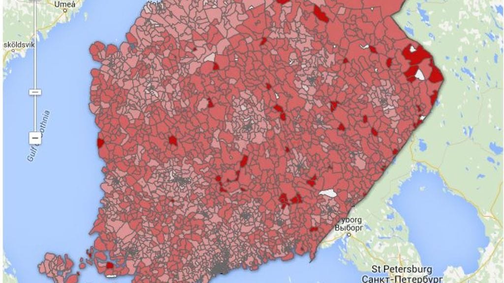 Klikkaa karttaa ja tarkista, minkä ikäistä väestö on omalla postinumeroalueellasi. Alueen väri on sitä tummempi mitä vanhempia asukkaat keskimäärin ovat. Luvut vuodesta 2013.