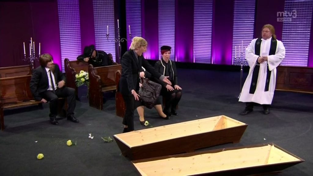 Tällä kertaa näyttelijäkaarti joutui suorittamaan sketsin juontaja Joonas Nordmanin ohjeiden mukaisesti. Tämä johti siihen, että huutokauppiaan hautajaisia vietettiin muun muassa modernin tanssin elkein, saksaksi sekä "vähän liian humalassa".