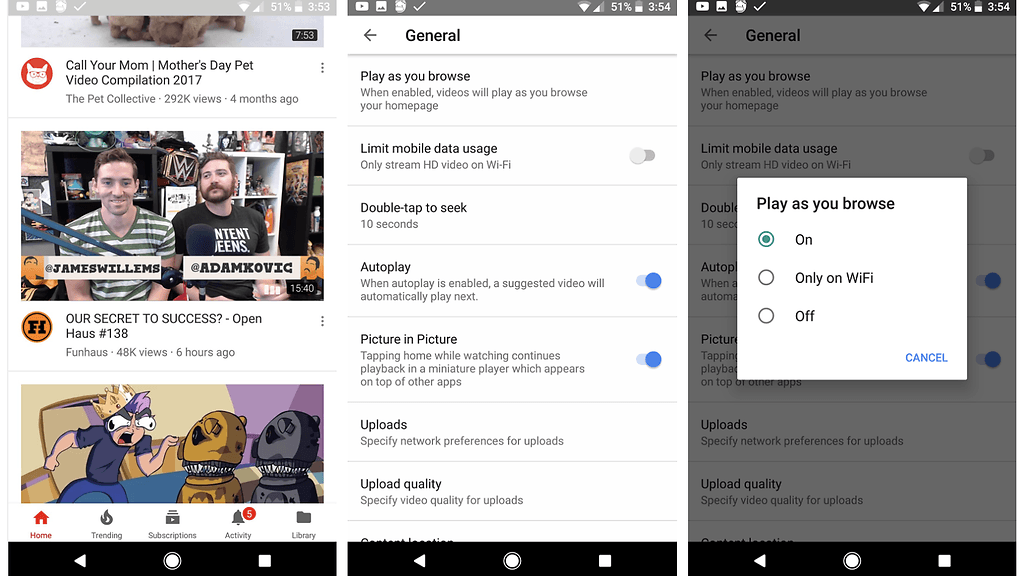 Lisäksi myös YouTubessa automaattisesti toistuvat videot voi myös kytkeä kokonaan pois päältä sovelluksen asetuksista. Videot voi valita toistumaan automaattisesti myös vain Wi-Fi-verkoissa, oletuksena ne toistuvat ainakin toistaiseksi myös mobiiliverkkoyhteyden yli.