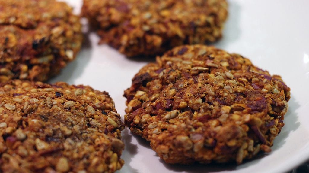 Tämä versio rakentuu jauhelihamaisen rakenteen omaavasta pihvistä, johon on käytetty mm. aurinkokuivattua tomaattia, auringonkukansiemeniä ja cashewpähkinöitä. Sämpylä pohjautuu manteli- ja tapiokajauhon kombolle. Kokosin burgeriohjeen kahdesta reseptistä ja lisäsin vielä höysteeksi toisaalta kirjasta manteliaiolin. Kantsii kokeilla!