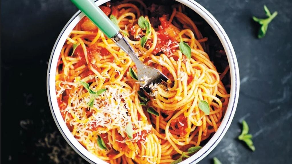Outi Väisäsen ja Elvi Ristan Samasta padasta – huippuhyvää kotiruokaa vauvallesi ja itsellesi -kirjan reseptillä valmistuu hitaasti haudutettu tomaattispagetti, joka maistuu sekä arkena että viikonloppuna.