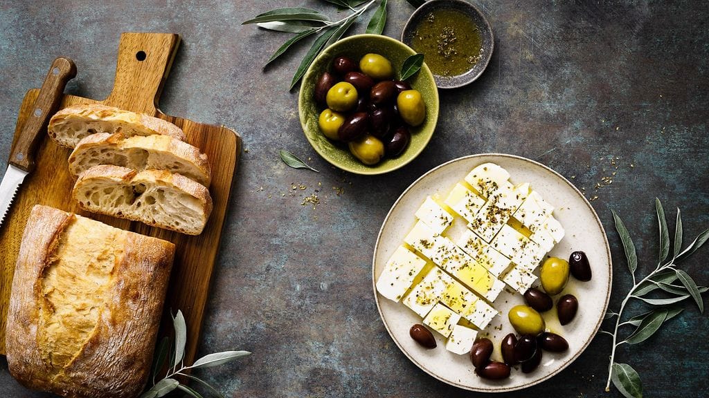 Kreikkalaisen keittiöön kuuluvat muun muassa oliiviöljy, oliivit, feta ja tomaatti.