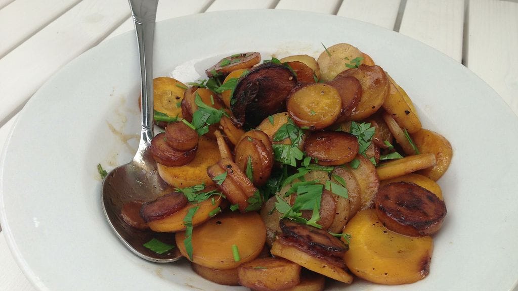 Juureksen makeus nousee paistettaessa esiin ja sitä tasapainottamaan on otettu syvää makua puhkuvaa balsamicoa. Yksinkertaista ja maukasta ja kotimaisilla porkkanoilla parempaa kuin mihin italialaiset pystyvät. Idea tuli mieleen Saku Tuomisen Basta!-kirjasta, vaikka vastaavanlaisia olemme nauttineet usein aiemminkin. Nautitaan sesongista, mutta toimii tämä tietty ympäri vuoden. Antipastona ja lisukkeena.