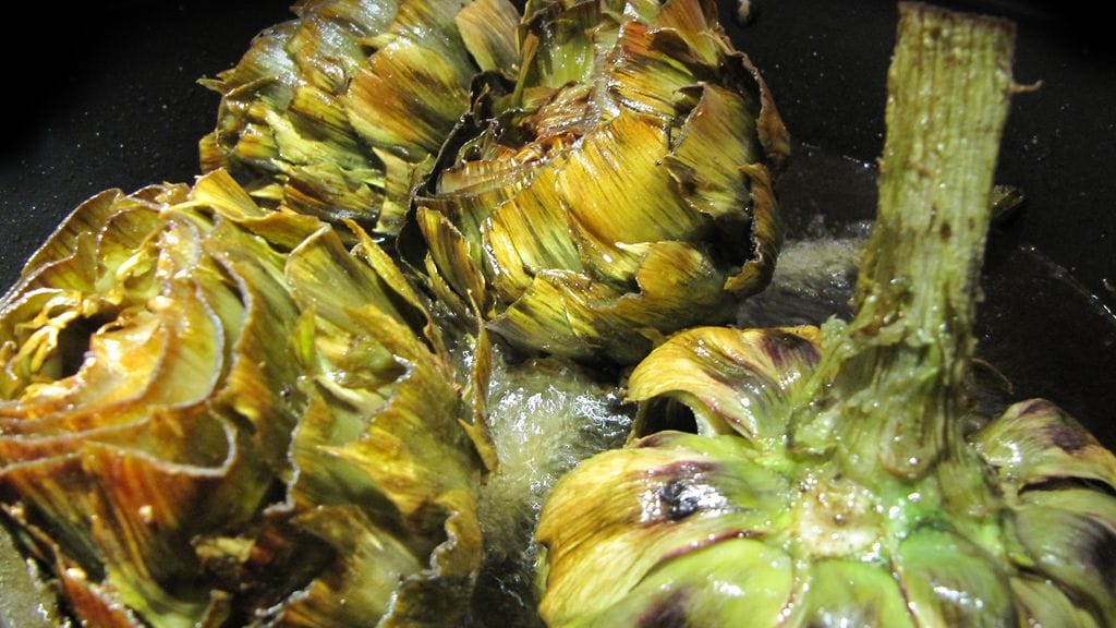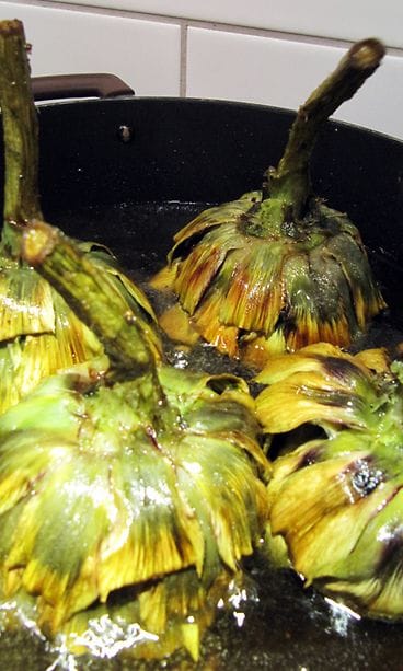 En ollut koskaan rohjennut ostaa tuoretta latva-artisokkaa, koska olin epävarma sen käsittelystä. Pääsiäinen on Italiassa ja etenkin Roomassa artisokkasesongin aikaa ja odotan innolla pääseväni kaluamaan tätä roomalaisten suurinta herkkua. Halusin kuitenkin päästä sinuiksi raaka-aineen kanssa, ettei siellä tarvitse ihmetellä, miten ruoka on tehty. Käsittely sujui yllättävän mutkattomasti ja lopputulos oli herkullinen. Tein viikonlopun aikana artisokkaa kolmella tapaa, jotka jaan tämän viikon aikana trilogiassa, jos vaikka joku rohkenisi testata pääsiäisenä. Trilogian toisessa osassa artisokka täytetään ja haudutetaan kypsäksi. Lopuksi tehdään tomaattista artisokka-kanapataa.