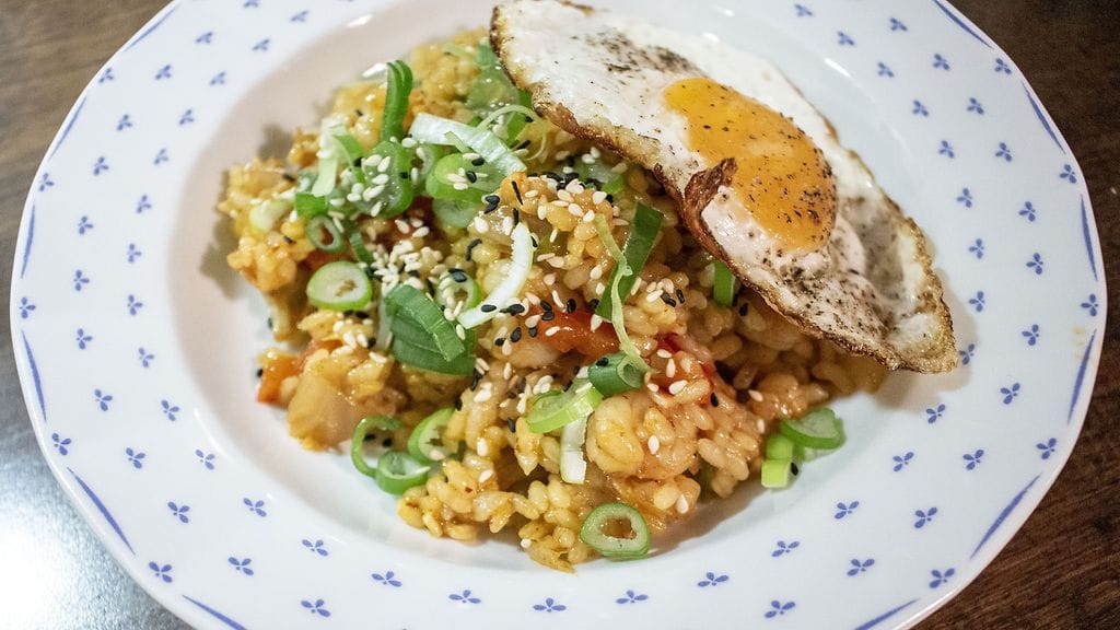 Paista kananmunat pannulla "sunny side up" (tai kuten haluat). Ota paistetut munat syrjään. Lorauta pannulle hiukan kasviöljyä ja lisää kimchi, sokeri ja chilitahna. Paista keskilämmöllä muutama minuutti, kunnes kimchi alkaa muuttua hiukan läpikuultavaksi. Maista ja säädä tulisuutta lisäämällä halutessasi chilitahnaa.