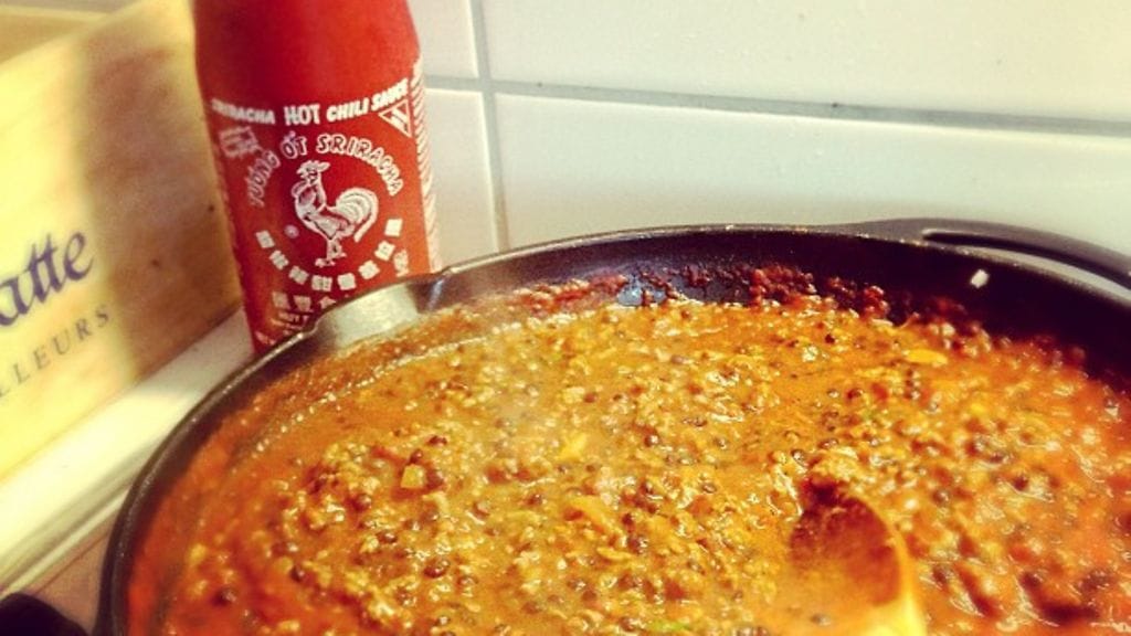 VINKKI! Voit käyttää chilinä mitä muotoa hyvänsä. Laitoin itse hiukan chilirouhetta ja perään Sriracha-kastiketta. Tarkoitus ei ole tehdä hodarista mahdollisimman tulista vaan maistuvaa.