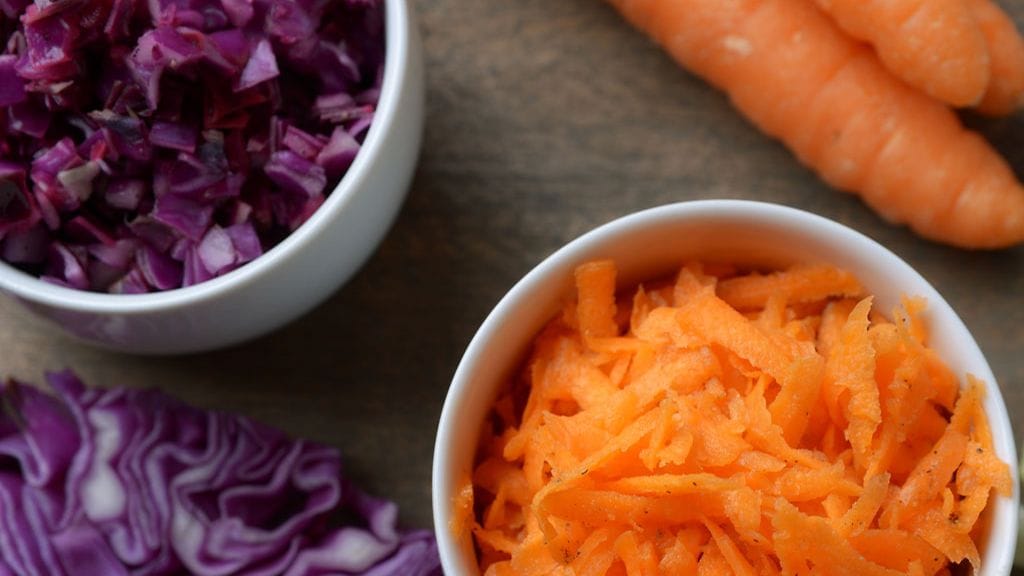 Paljon kuitua sekä C- ja A-vitamiinia – tämä salaatti tuo lautasellesi väriä ja makua sekä apua elimistön puhdistukseen. Romaine-salaatin vesipitoisuus nesteyttää elimistöä ja punakaalin ja porkkanoiden runsas kuitupitoisuus auttaa ruoansulatuksessa.