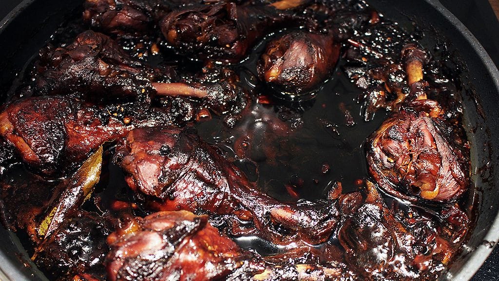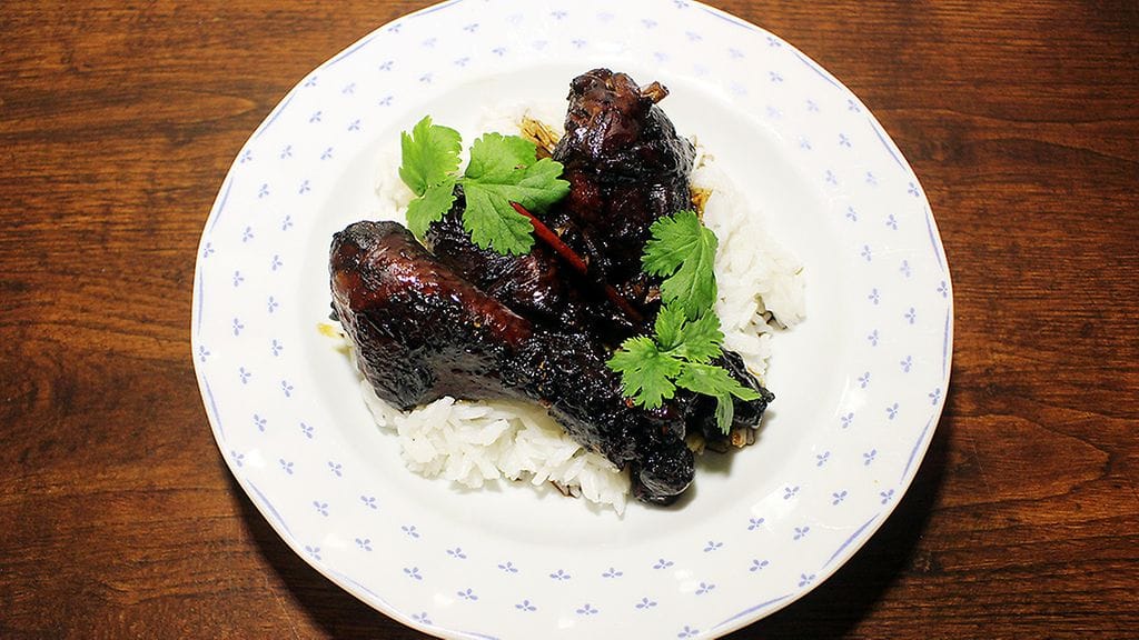 Maun ydin pohjaa kolmen liittoon: viinietikkaan, soijaan ja valkosipuliiin. Niistä saadaan marinadin pohja, jossa kana kylpee muutaman tunnin tai yön yli. Sen jälkeen kokkaaminen onkin hirmu simppeliä. Paistat vain kanan ja keität marinadia kokoon riisin kypsentyessä. Loistava ruoka, kun haluat päästä helpolla.