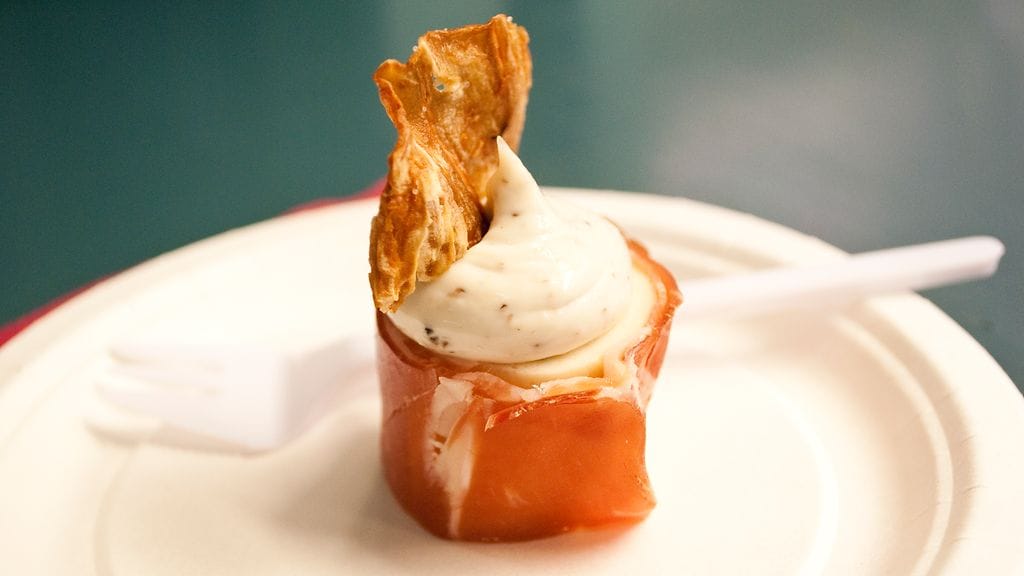 1. Parmankinkkuun käärittyä broilerimureketta, tryffelimajoneesia ja sellerisipsi