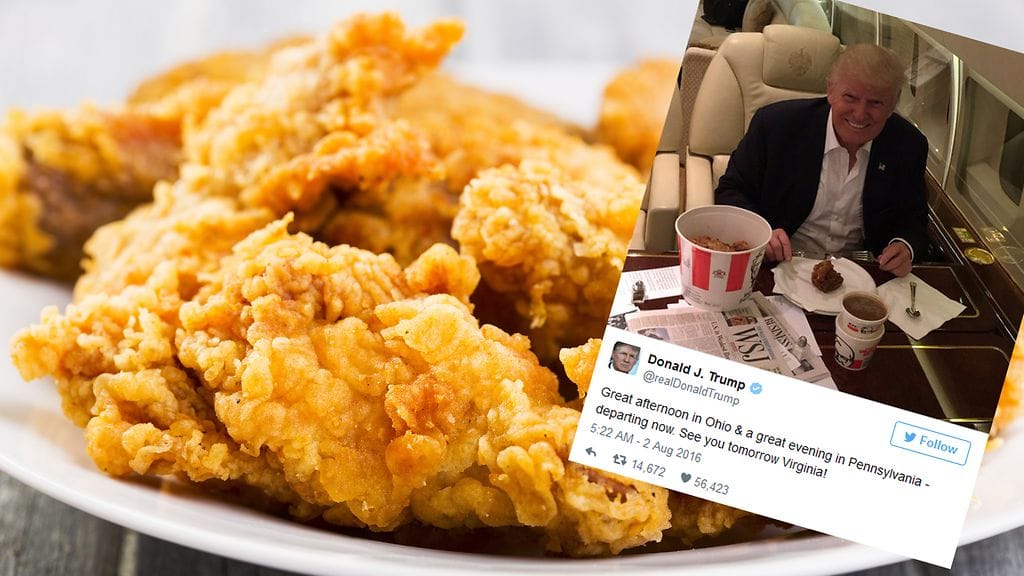 Twiittinsä yhteyteen Trump lisäsi kuvan herkutteluhetkestään. Tämä sai Twitter-käyttäjät innostumaan, sillä Yhdysvalloissa on tapana käydä small talkia siitä, kummat kananpalat ovat enemmän mieleen: Kentucky Fried Chickenin vai toisen pikaruokayrityksen, Popeye'sin. Trumpin mielipide tähän ikuisuuskysymykseen selvisi kuvan myötä, sillä hänen edessään komeilee kulhollisia Kentucky Fried Chickenin herkkuja.