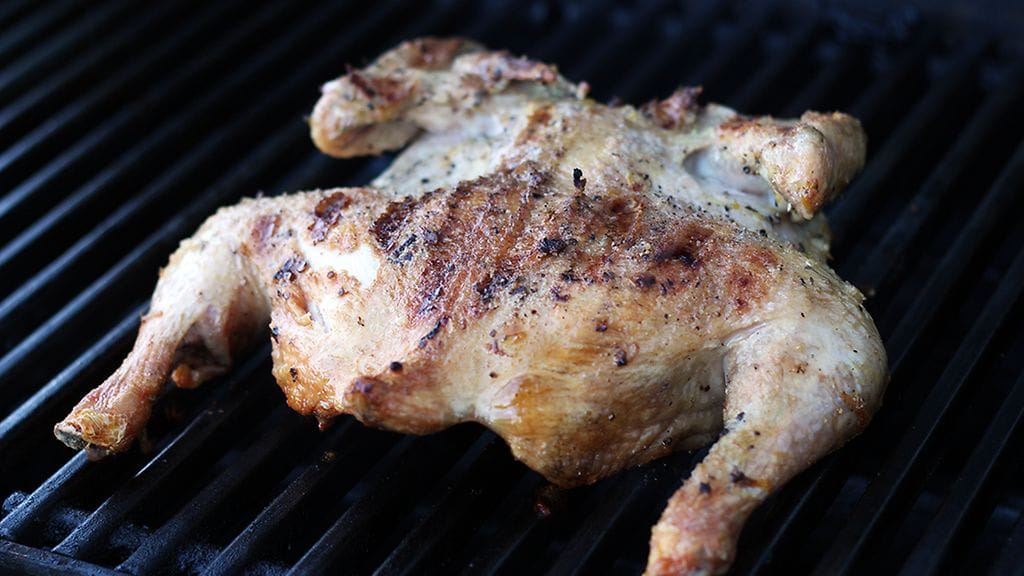 Sekoita keskenään oliiviöljy, 2 rkl timjamia, 1 sitruunan raastettu kuori ja valkosipulisilppu. Avaa broileri keskeltä rintapuolelta veitsellä ”perhoseksi” ja levitä tipu auki. Hiero marinadi nahkapuolelle ja anna marinoitua 2 tunnista yön yli jääkaapissa (tai jos pukkaa kylmää säätä niin ulkona linnuilta suojassa).