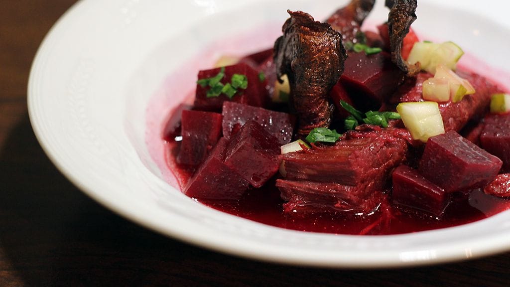 Monenlaista juuresta ja hitaasti kypsennettävää lihaa – avain mielenkiintoni herättämiseen. Häränrinta on ehkäpä se kaikkein maistuvin osa naudasta. Pitkään haudutettuna sen pitkät ja paksut säikeet hajoavat upeasti kielen päällä. Yhdistettynä punajuuren mehevään ja aistikkaaseen olemukseen, syntyy talven hyistä säätä uhmaava upea ruoka.
