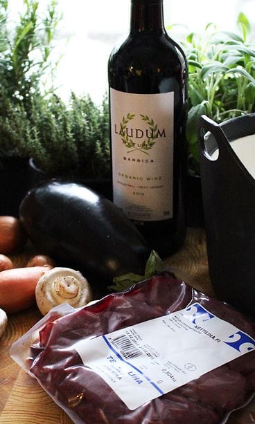 Kokkasin kesäreissun tunnelmissa perinteisen Daube Provencalen, josta tämä versio eroaa siinä, että tomaattimurska on korvattu kokonaan punaviinillä ja oliivit munakoisolla ja herkkusienillä. Same but different.